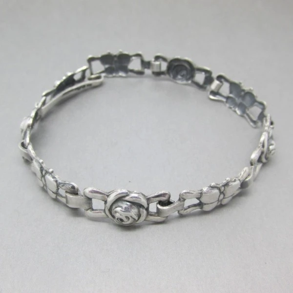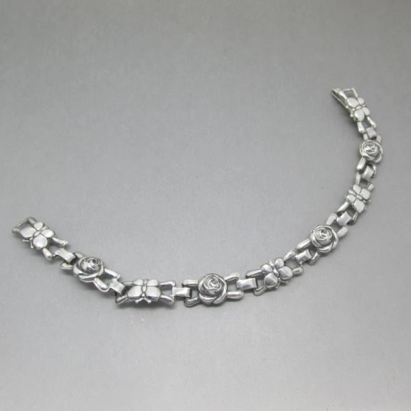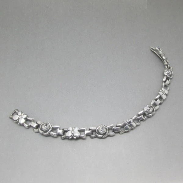 Detailed vintage sterling silver roses and butterflies bracelet by Swedish brand ALTON dated 1951. The bracelet measures approximately 6.75 inches (17 cm) . It has a flat hook type closure clasp. It is fully hallmarked with "ALTON" and "A9"- 1951. It is in very good vintage condition. Condition: Very Good Colour/Gemstone: Silver Metal: Sterling Silver Size: 6.75 inches (17 cm) Era: 1951
