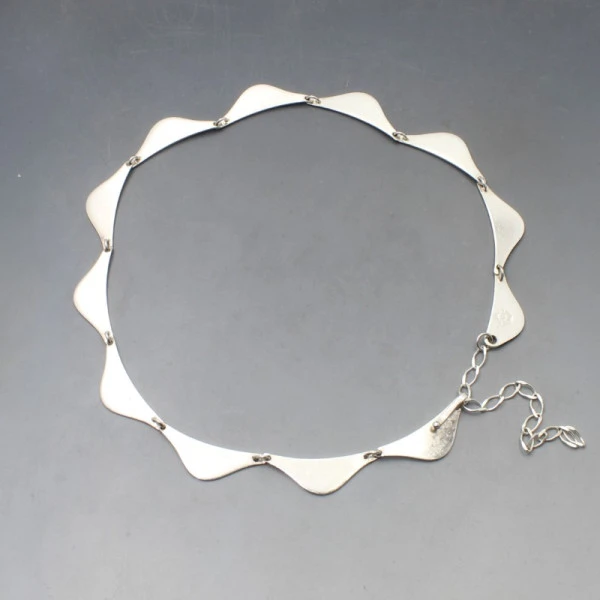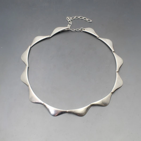 Vintage Aare and Krogh, Denmark, modernist sterling silver link necklace. It comprises a series of smooth flat wing shaped links and has a silver toggle clasp closure with extension chain. It is signed "STERLING, A & K, DENMARK." The silver links part of the necklace measures approximately 15 inches (39 cm) and there is a further 3 inch extension chain, making the necklace adjustable between 15 to 18 inches (39 to 46 cm) The links each measure approximately 3.5 x 1 cm. It is estimated to date from the 1960's. Weight is 29 grams. It is in very good condition with small signs of wear commensurate with age.