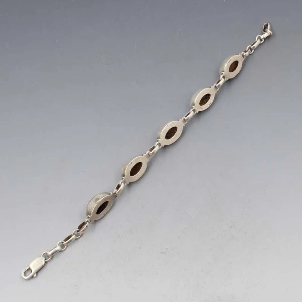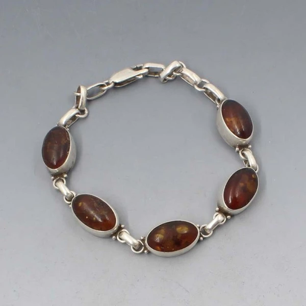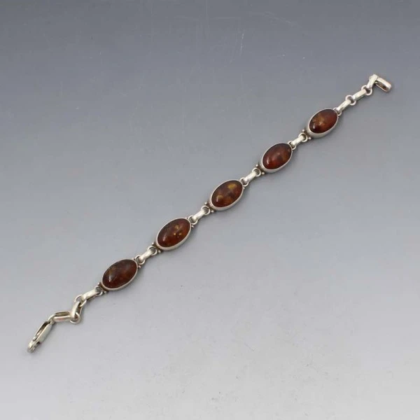 Vintage amber gemstone and sterling silver bracelet. The eclipse shaped amber gems are bezel set in sterling silver settings. It has a lobster clasp closure and is marked "925" for sterling on the rear. It measures approximately 7.5 inches (18.5 cm ) Weight is 14 grams. It is in very good condition. Condition: Very good Colour/Gemstone: Amber and silver Metal: Sterling Silver Size: 7.5 inches (18.5 cm) Era: