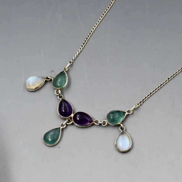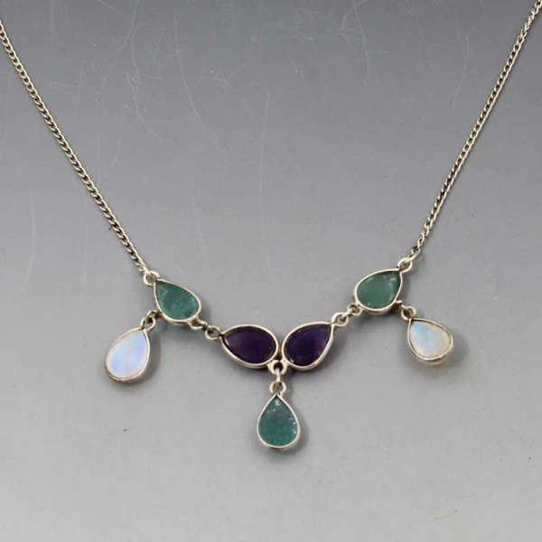 Pretty vintage amethyst, apatite, moonstone, and silver necklace. The pear shaped gems are bezel set in sterling silver settings. The necklace has a sterling silver chain with spring ring clasp closure. The necklace measures approximately 41 cm (16.5 inches). Weight is 6.8 grams. This is new old stock in very good condition.