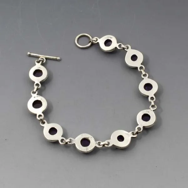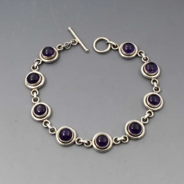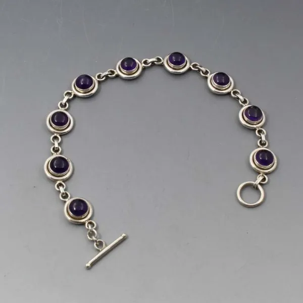 Lovely vintage amethyst and sterling silver disc bracelet. The amethyst gems are bezel set in sterling silver open backed disc type settings. .It has a sterling silver toggle clasp closure and measures approximately 19 cm (7.5 inches). It is marked 925 on the rear. Weight is 16.9 grams The bracelet is new old stock. It is in very good condition.