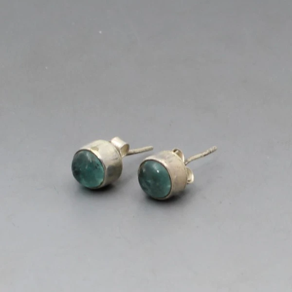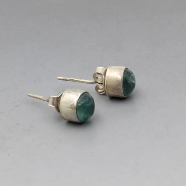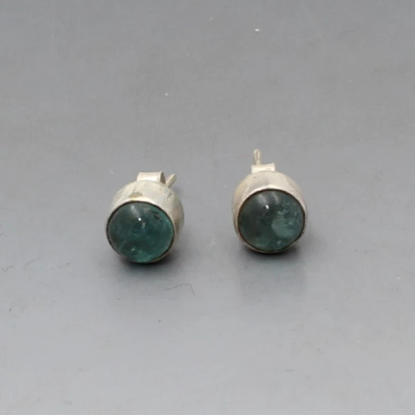 Vintage apatite and sterling silver stud earrings. The round shaped apatite gems are bezel set in sterling silver settings.The earrings each measure approximately 0.6 cm in diameter and have silver post and butterfly fittings. This is new old stock and they are in very good condition.