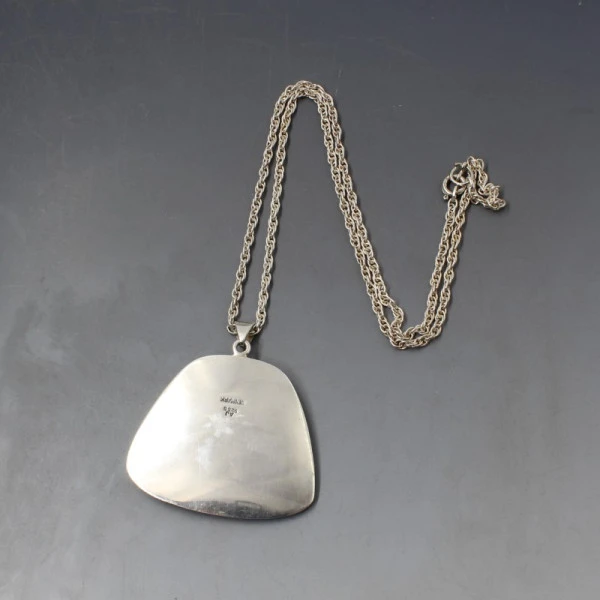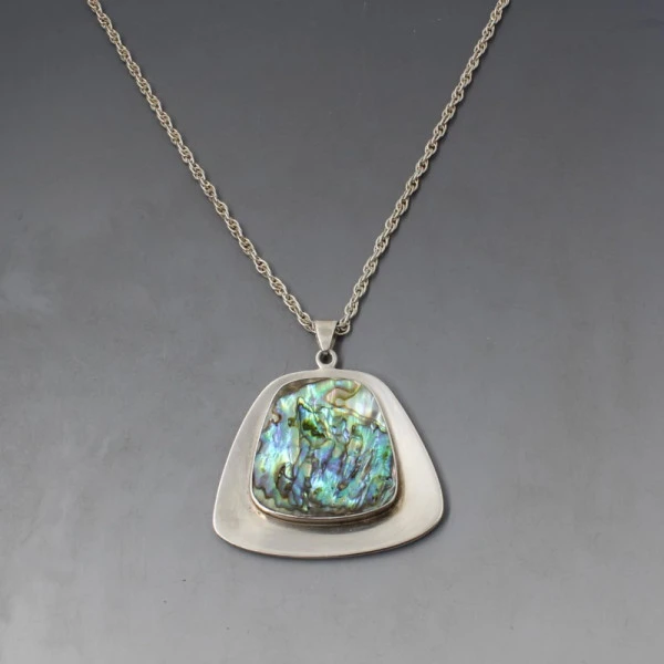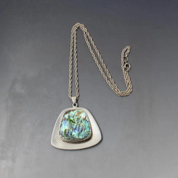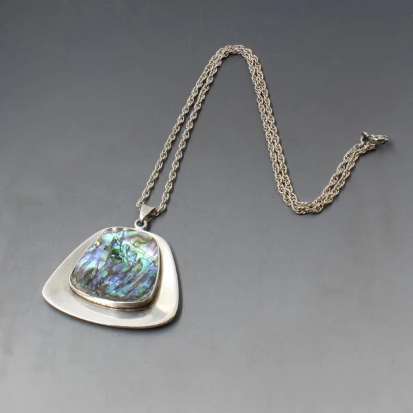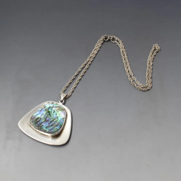 Beautiful vintage Arne Johansen, Denmark, sterling silver and abelone shell pendant. The necklace has a 20 inch (51 cm) sterling silver rope chain with spring ring clasp closure. Weight is 30 grams. It is signed "AJ 925S DENMARK" on the rear. It is in very good condition . A matching Arne Johansen brooch is available. Condition: Very Good Colour/Gemstone: Silver Metal: Sterling silver Size: 20 inches (51 cm) Weight: 30 grams Era: