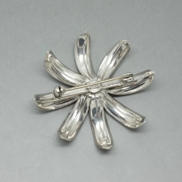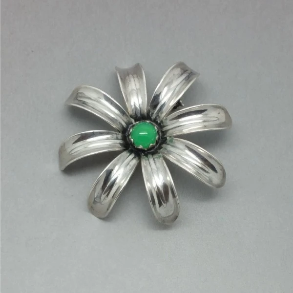 B. Munksgaard Denmark modernist sterling silver flower brooch with 6mm green chrysoprase centre. The brooch is signed "BM" and "STERLING DENMARK". It measures approximately 4.4 cm in diameter and has a rollover clasp and pin closure to the rear. It is estimated to date from 1925 to 1937. Weight is 9.6 grams It is in very good vintage condition Condition: Very good Colour: Silver Metal: Sterling Silver Size: 4.4 cm diameter approximately Weight : 9.6 grams Era: 1925 to 1937