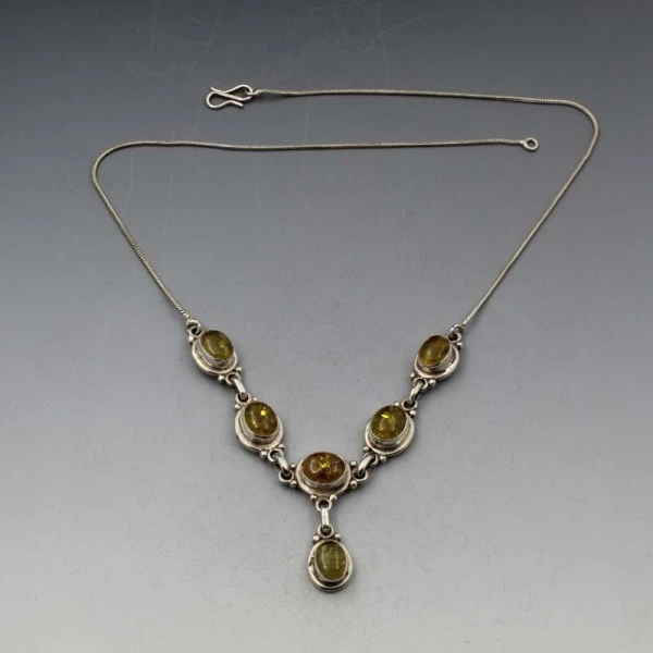 Beautiful vintage natural baltic amber and sterling silver drop necklace. The oval shaped yellow amber cabochons are bezel set in sterling silver open backed settings. The necklace has a 17 inch sterling silver snake chain with hoop clasp closure. It is marked 925 on the clasp. The necklace measures 18 inches (45 cm) and weight is 17.8 grams. It is in very good condition.