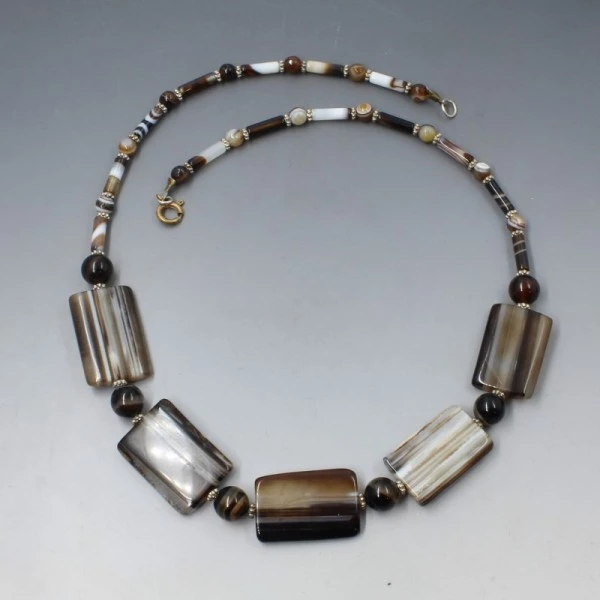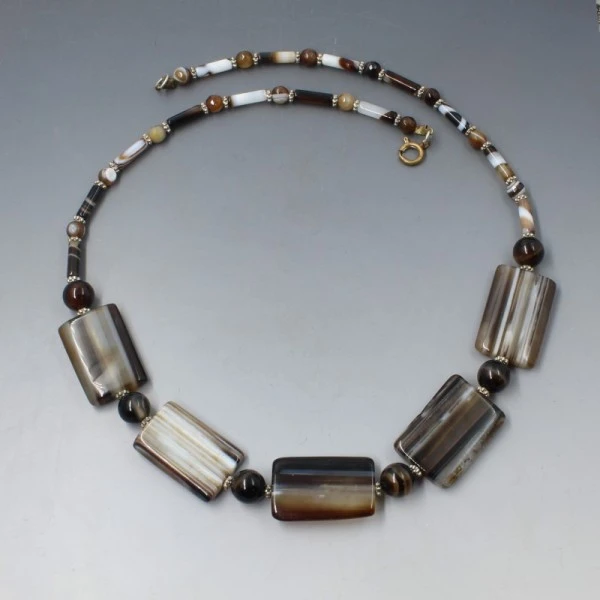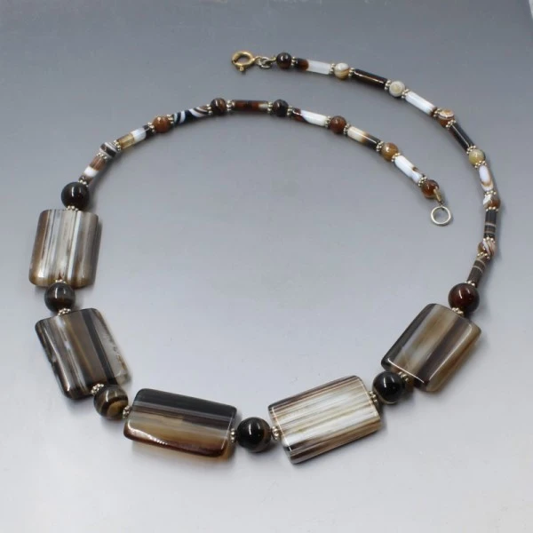 Vintage banded agate beads necklace. The large rectangular shaped banded agate beads are interspersed with circular agate beads and the set has a spring ring clasp closure. The set measures approximately 23 inches (59 cm). The rectangular agate beads measure approximately 2.8 x 1.7 cm. Weight is 58 grams. The necklace is in very good condition. Estimated to date from 1960's to 1980's.