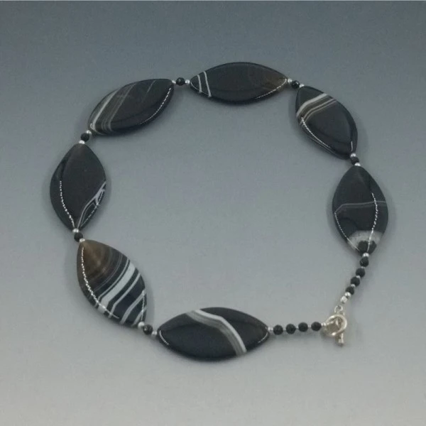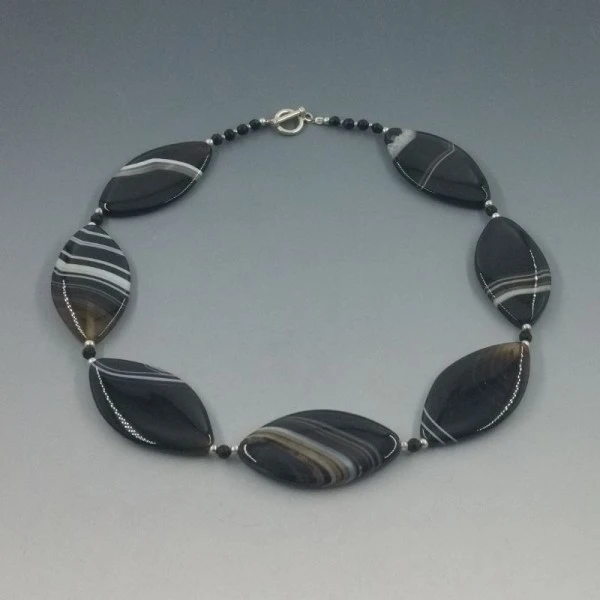 Lovely quality banded agate and sterling silver statement necklace. The round shaped agate beads are black/ dark brown agate beads with light grey stripes and there are small sterling silver beads towards the lobster clasp closure. The necklace measures approximate..