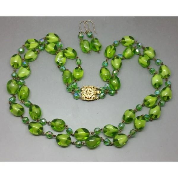 Beautiful vintage 1950's necklace comprising a double row of Czech givre glass beads in a gorgeous peridot green colour. The necklace is tiered and measures approximately 52cm (20.5") at its shortest including the goldtone filligree metal push in clasp. The larger beads are approx 1.2cm across. with matching faceted glass spacers in between. The beads are wired together. They are in very good vintage condition. Condition: Very Good Colour/Gemstone: Green Czech givre glass beads Metal: Gold Tone Size: 52cm (20.5) inches approximately shortest row Era: 1950'S