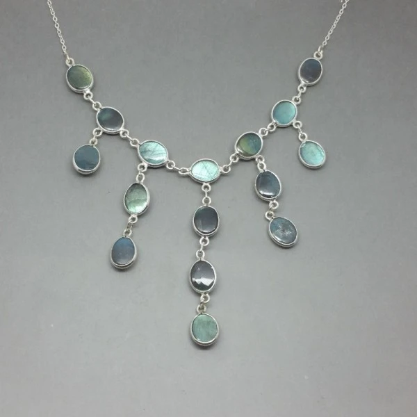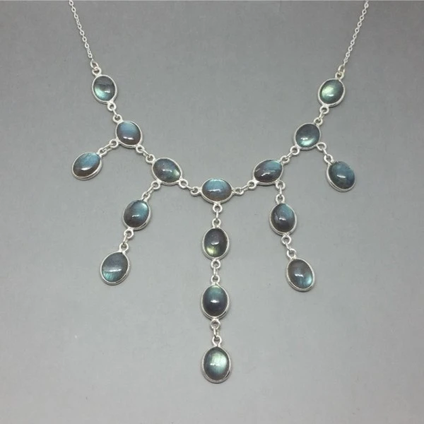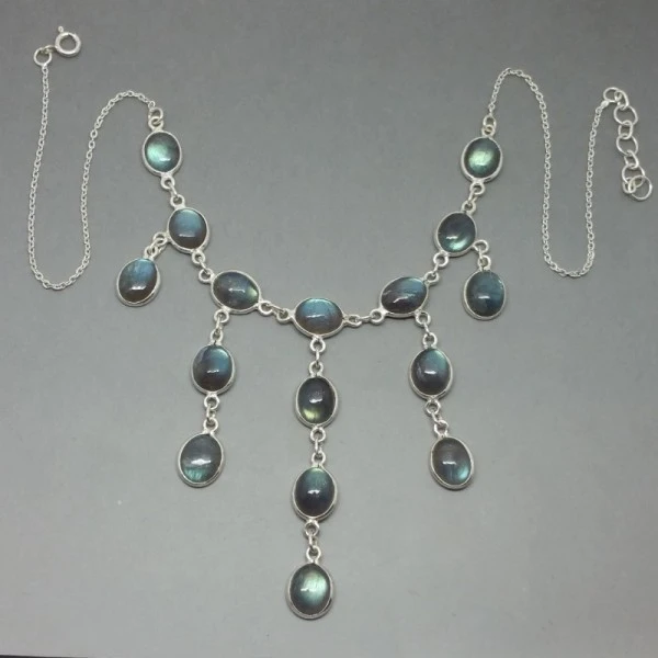 Beautiful quality vintage labradorite necklace with oval labradorite cabochons bezel set in sterling silver settings with a sterling silver chain. The chain measures approximately 41cm (16 inches ) at full extension and has a springring necklace fastening. The longest central drop (with 4 cabochons) measures 6 cm.The clasp is marked with 925 for sterling silver. It is in very good condition .