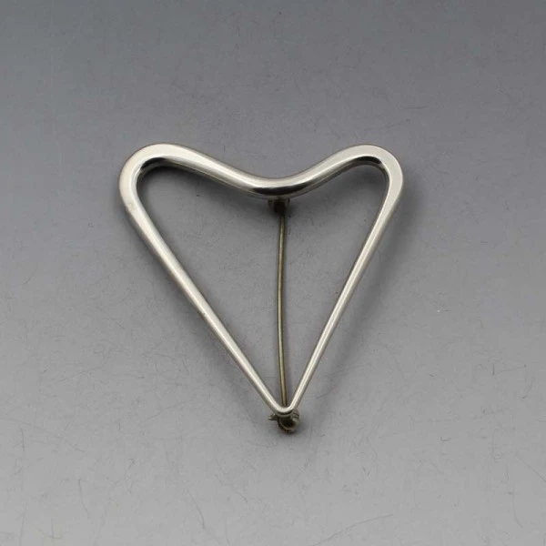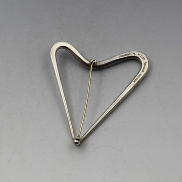 Bent Knudsen, Denmark, 1950's sterling silver heart (or harp?) brooch. It has a pin and rollover C clasp closure. It is signed "STERLING, DENMARK, BENT K 1 HANDMADE. " It was the first brooch he produced in his own workshop. The brooch measures approximately 5.8 cm x 4.9 cm. Weight is 13.2 grams. It is in very good condition.
