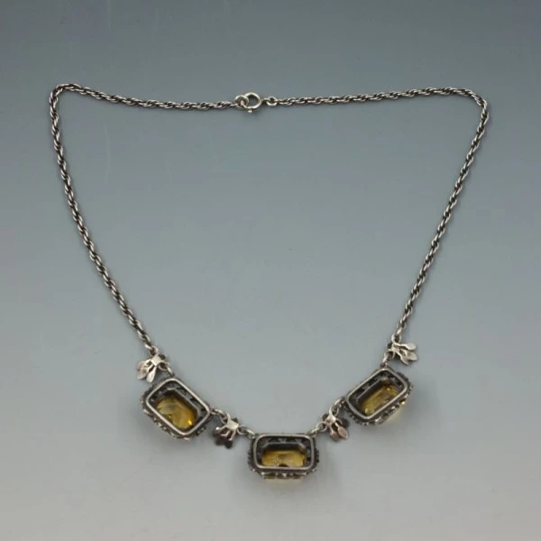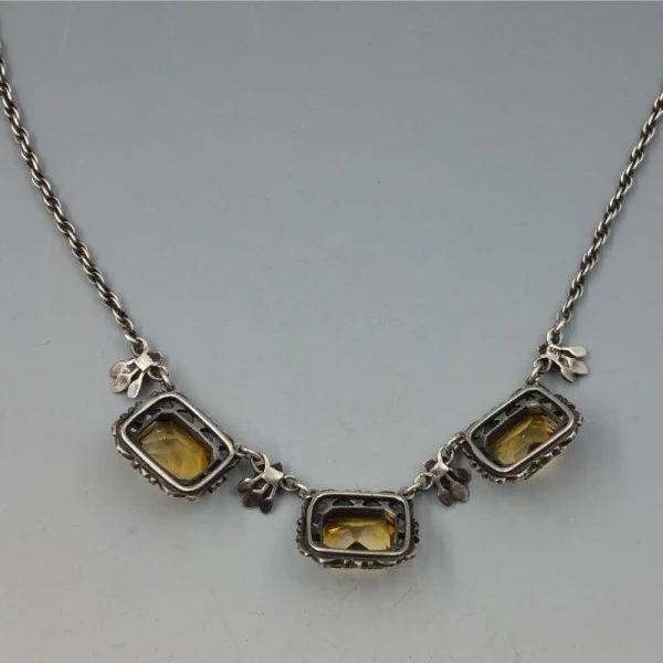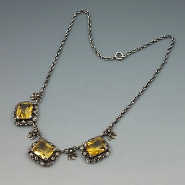 Beautiful citrine and sterling silver necklace attributed to Bernard Instone. It has a detailed silver floral design with three large facted beautiful quality citrines prong set in openbacked sterling slver settings. It has a sturdy silver chain with spring ring clasp closure. The chain measure approximately 15.5 inches (40 cm). Each citrine gem measures approximately 1.2 x 1 cm. Weight is 18.8 grams. It is marked Silver on the rear and has no makers mark, It is attributed to Bernard Instone. Estimated to date from 1930's to 1950's. It is in very good condition.