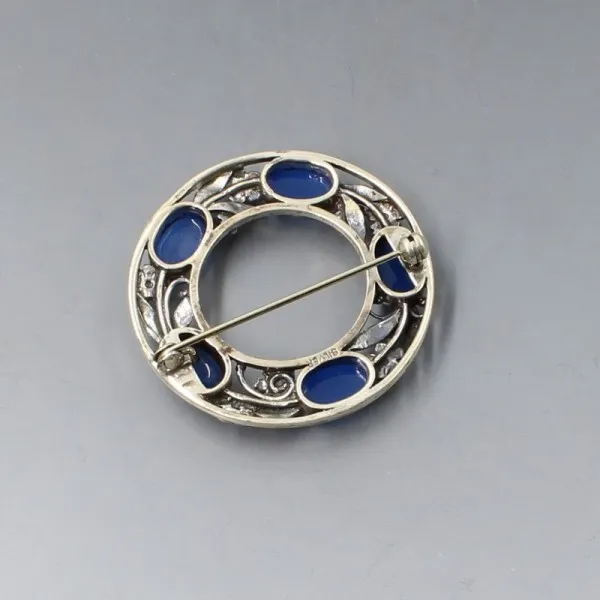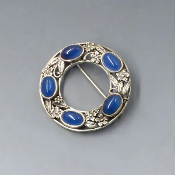 Beautiful quality arts and crafts and Bernard Instone style blue chalcedony and sterling silver vintage brooch.The rear and side of the brooch is marked " SILVER" .The brooch is in very good condition and measures approximately 4 cm in diameter. Weight is 14 grams. It has a silver pin and rollover "C" clasp closure to the rear.