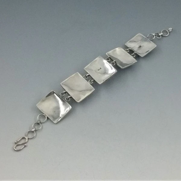 Decorative vintage solid sterling silver link bracelet. It has five almost square shaped silver panels with a decorative flower design. The middle 3 panels have oval blue lapis lazuli stones bezel set in sterling silver settings. The bracelet is marked "925" on the rear and measures approximately 7.5 inches (19 cm ). It has a hook clasp closure. Weight is 24.7 grams. It is in very good condition.
