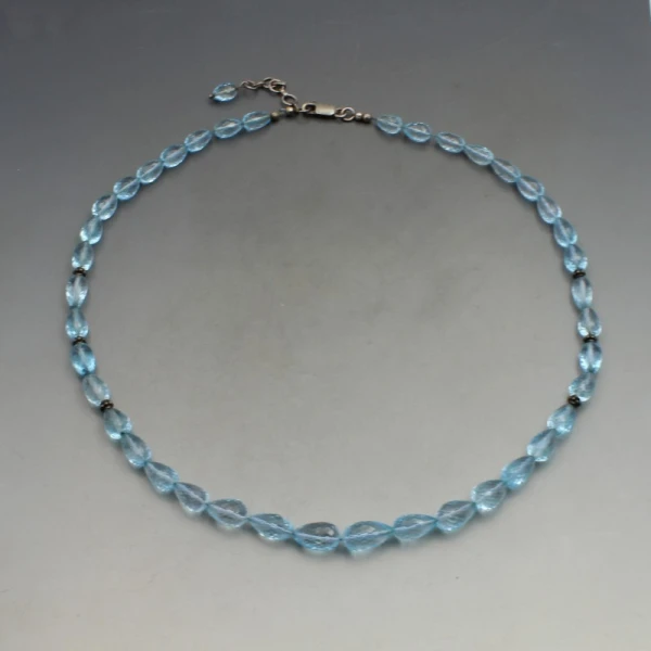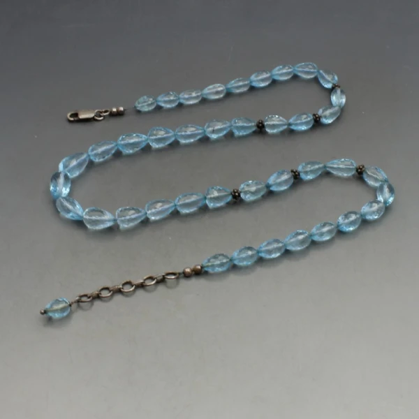Beautiful vintage blue topaz and sterling silver beads. The set measures approximately 17.5 inches (43 cm) and is adjustable to 19 inches (48 cm). It has a sterling silver lobster clasp closure. The faceted blue topaz beads are graduated in size with small silver spacer beads at intervals with the largest blue topaz bead measuring approximately 1.2 x 0.6 cm. Weight is 32 grams. The set in very good condition .