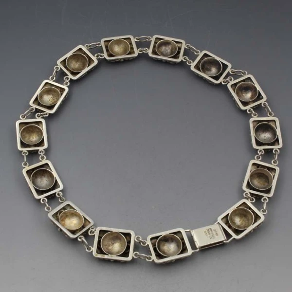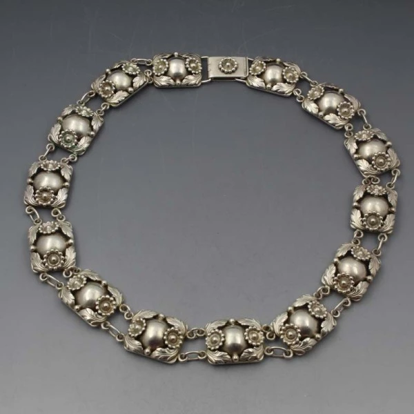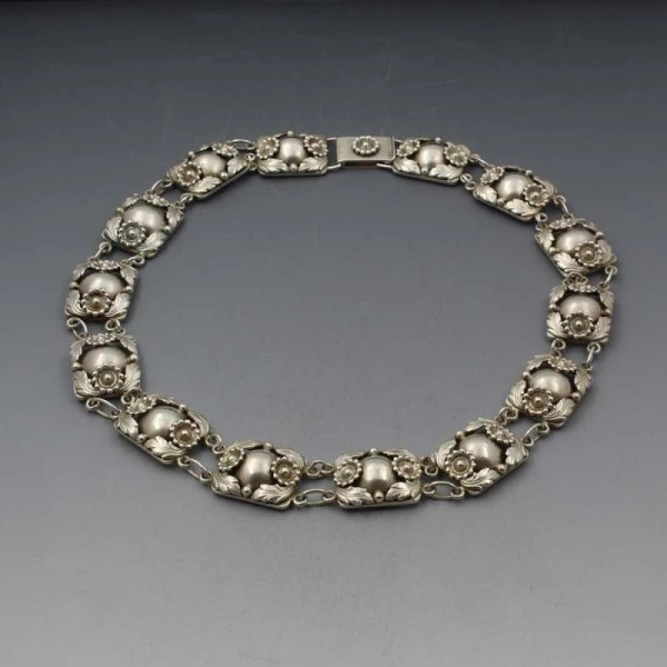 Vintage Hans Julius Larsen, Denmark 830 silver art nouveau style necklace. The necklace has a series of floral art nouveau style links and an 830 silver hook clasp closure. It is signed with makers marks "JL" and "830S". It measures approximately 16.5 inches (42 cm). Weight is 43 gra..
