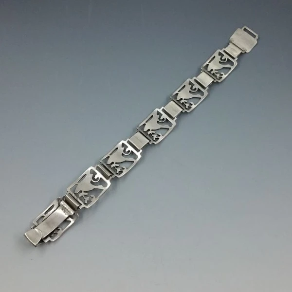 Lovely C Brumberg Hansen, Denmark, vintage art nouveau style 830 silver bracelet. It has a series of 6 rectangular links with a decorative dove and foliage design. It has a hook and foldover clasp closures and measures approximately 20.5 cm (8 inches). Weight is 25.2 grams.It is signed with "C B H 830S" on the rear. It is in very good condition and is estimated to date from the 1930's to 40's