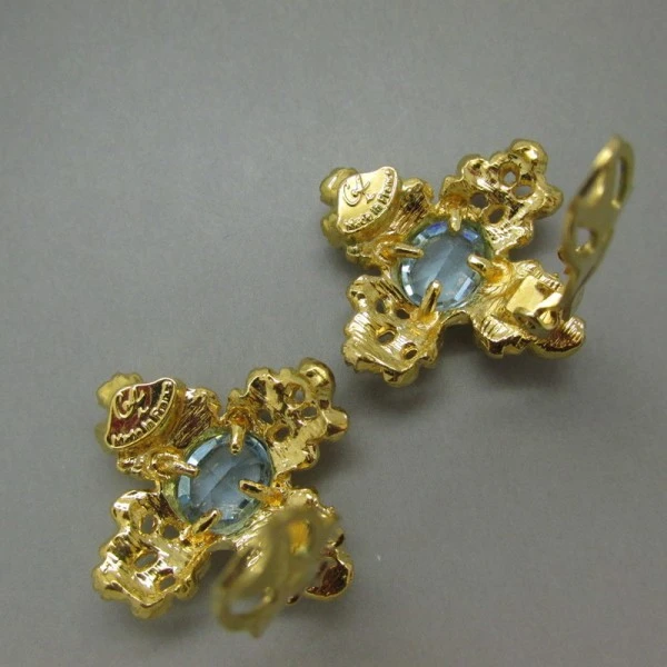 These beautiful Christian Lacroix vintage earrings have a gold plated flower design with sparkling aquamarine crystal centres. The flower "petals" have a detailed gold plated design and the rear of the earrings also has a gold plated finish. Each earring measures approximately 2.5 x 2.5cm. The earrings are estimated to date from the 1980's and are in excellent condition. The earrings have clip on fastenings and they are marked with the Christian LaCroix signature and "Made in France" on the rear of the earrings. These are exceptional quality earrings as you would expect from Christian Lacroix and would make a sparkling designer addition to an outfit.