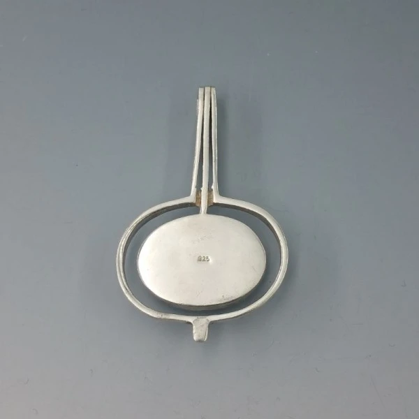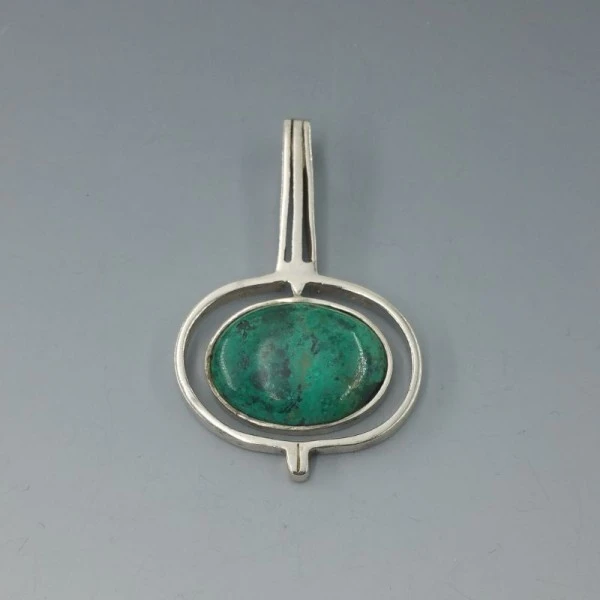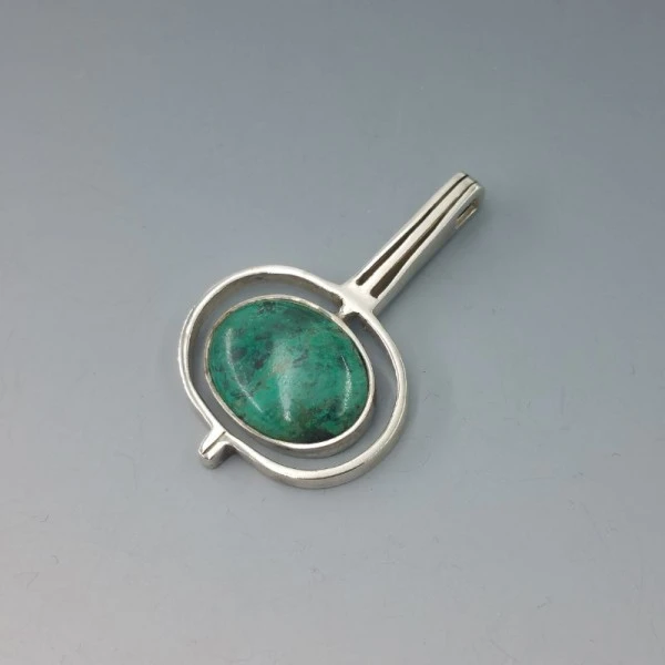 Stylish chrysocolla and solid sterling silver vintage modernist pendant. It is marked 925 on the rear. It measures approximately 5.8 x 3.7 cm. Weight is 21.8 grams. Very good condition.