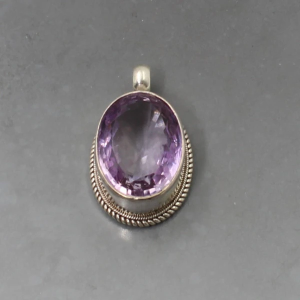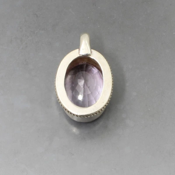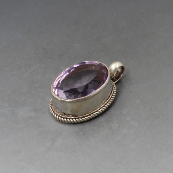 Vintage chunky amethyst and sterling silver pendant. The oval faceted amethyst cabochon is bezel set within a deep open backed decorative sterling silver setting with silver pendant bail. The pendant measures approximately 3 x 2.3 cm (not including the bail). Weight is 17 grams. It is marked "925" on the rear. It is in very good condition. Estimated to date from 1950's to 1970's Condition: Very Good Colour/Gemstone: Silver and amethyst Metal: Sterling silver Size: Approximately 3 x 2.3 cm pendant (not including the bail) Weight: 17 grams Era: Estimated 1950's to 1970's