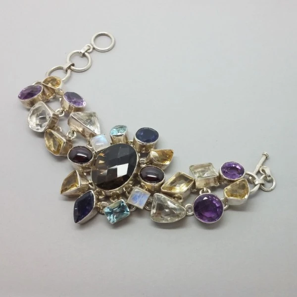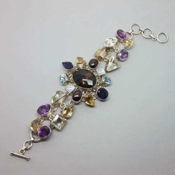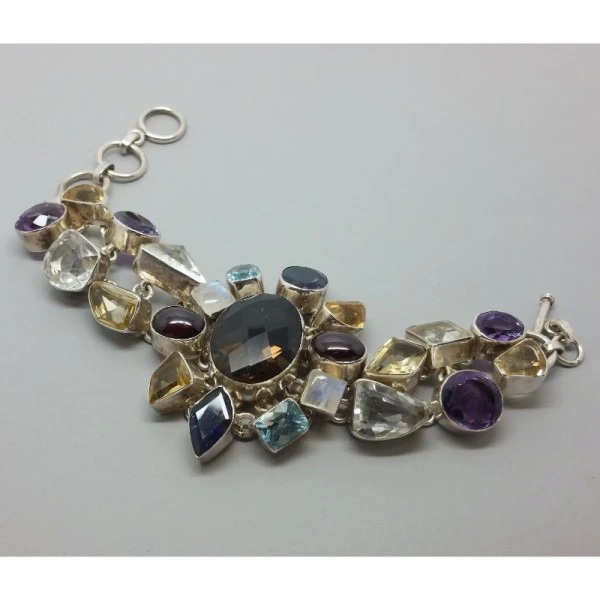 Stunning and beautiful quality chunky vintage multi gemstone statement bracelet . It comprises a mixture of citrine, amethyst , moonstone, crystal quartz, garnet and aquamarine gems with a large oval faceted central smokey topaz. All the gems are bezel set in sterling silver settings. This is a very well made solid statement piece bracelet with a sterling silver toggle clasp closure. All the gems are connected via small circular sterling silver links and the bracelet is marked "925" on the rear for sterling silver. The bracelet measures approximately 7.5 inches (19 cm) . Weight is 71.6 grams It is in very good condition. Condition: Very Good Colour/Gemstone: Amethyst, Citrine, Moonstone, Garnet, Moonstone Aquamarine, Smokey Topaz Metal: Sterling Silver Size: 7.5 inches (19 cm) Era: