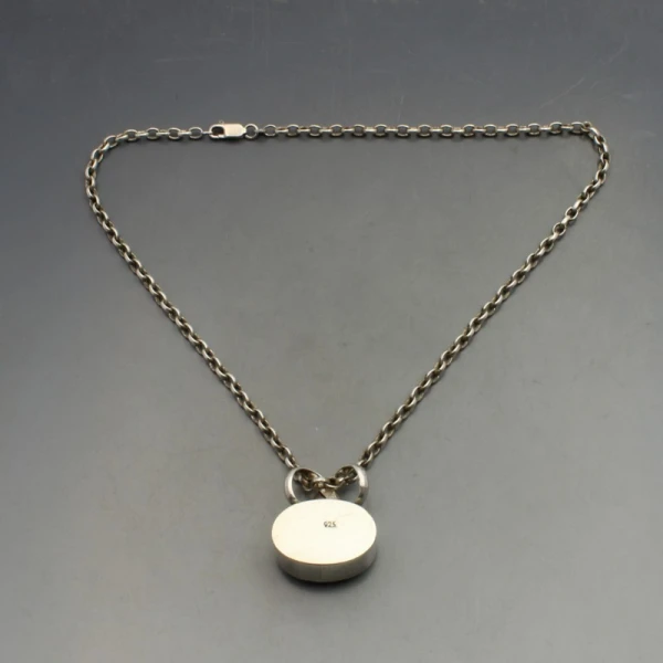 Condition: Very Good Colour: Silver Metal: Sterling silver Size: Approximately 41 cm (16 inches) long chain with 2.4 x 1.8 cm pendant. Era: