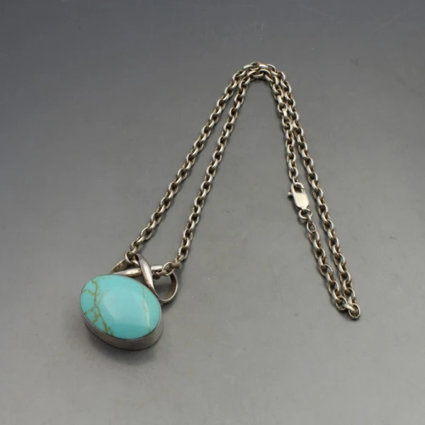 Vintage solid turquoise and sterling silver pendant. The turquoise stone measures approximately 2.4 x 1.8 cm and is bezel set within an oval sterling silver setting. The sterling silver chain measures approximately 41 cm (16 inches) long . It is marked "925" . Weight is 23 grams. It is in very good condition .