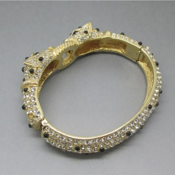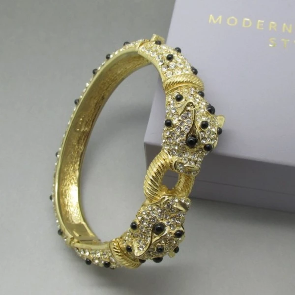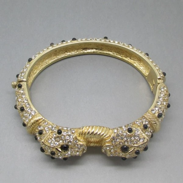 Rare and gorgeous vintage panther bracelet by Ciner. It is covered in sparkling clear diamante crystals with small black enamel spots.The faces of the two panthers are beautifully detailed with black eyes and clear crystal faces on a gold tone base. It fastens with a box type closure and has a gold tone finish to the rear. It is signed with "CINER" on the inner side. The bracelet measures approximately 7.2 x 6.2 cm (external dimensions).Internal dimensions are approximately 6 cm x 4.5 cm. It is in excellent condition