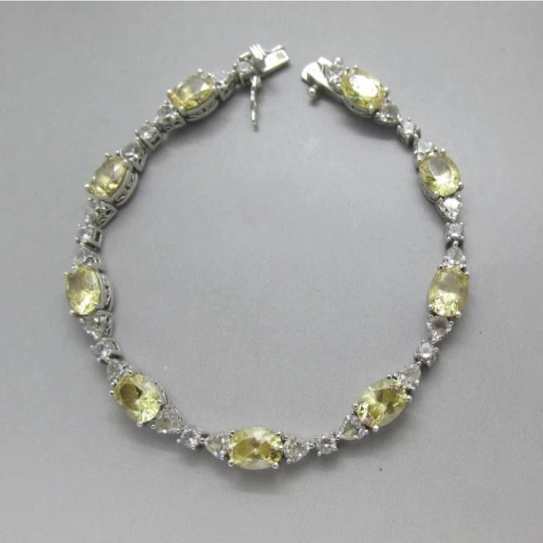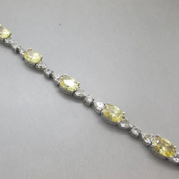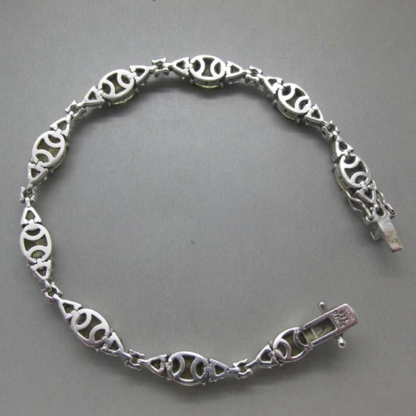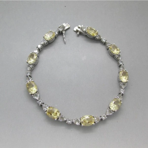 Beautifully detailed lovely quality vintage citrine and clear crystal bracelet with crystals prong set in sterling silver settings . The bracelet measures approximately 7.5 inches (19 cm) . It has a box clasp closure with safety clasps. It it marked with "925" on the rear and is in excellent conditon Condition: Excellent Colour/Gemstone: Silver and citrine and clear crystal Metal: Sterling Silver Size: 7.5 inches (19 cm) Era: