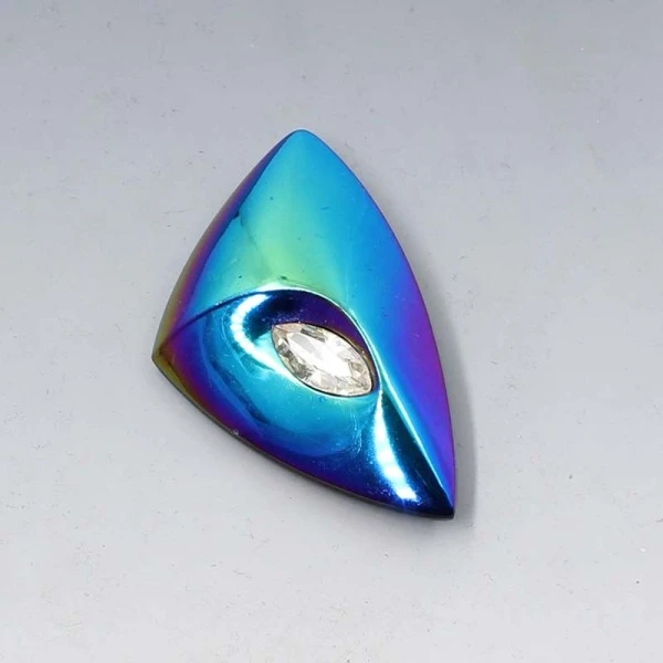 Unusual futuristic Czech 1950's opaque glass brooch with iridescent blue/green/yellow colour finish and eclipse shaped clear crystal.The broochhas a pin and C clasp closure to the rear. It measures approximately 6 cm x 3.4 cm (at the widest part). Weight is 14 grams. It is in very good condition with small signs of wear commensurate with age.
