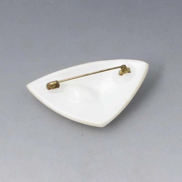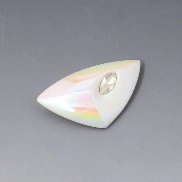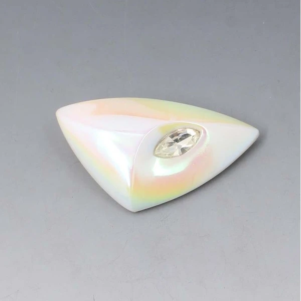 Unusual futuristic Czech 1950's light coloured opaque glass brooch with pearlised finish and eclipse shaped clear crystal. The brooch has a pin and C clasp closure to the rear. It measures approximately 5.8 cm x 3.5 cm (at the widest part). Weight is 13.8 grams. It is in very good condition with small signs of wear commensurate with age.