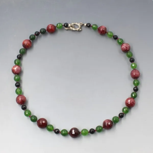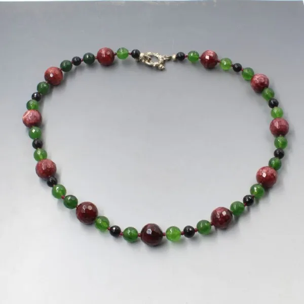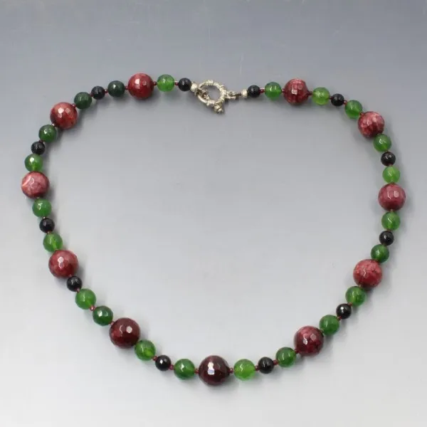 Vintage Czech multi colour glass bead necklace. The faceted round beads are a mixture of green, black and mottled pink/ purple colours and the set has a silver tone toggle clasp closure. The set measures approximately 18 inches (46 cm) long. The largest beads measure approximately 1.1cm in diameter. Weight is 48 grams. The necklace is in very good condition. Estimated to date from 1960's to 1970's.