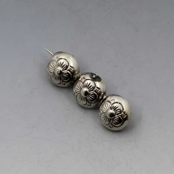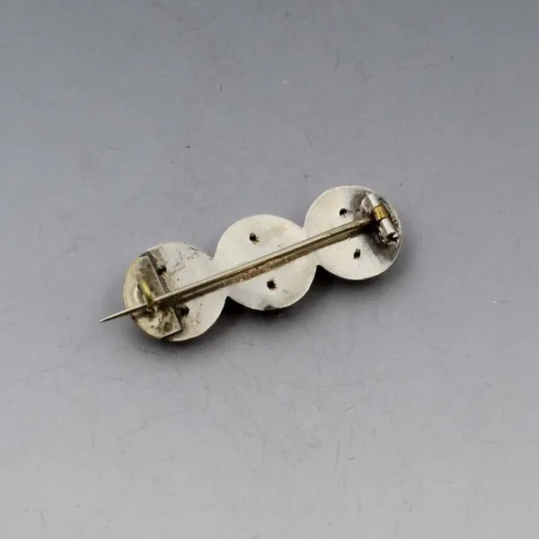 Danish vintage 830 silver triple flower detail bar brooch. The brooch is signed "830 S" and has a pin and rollover C clasp to the rear. It measures approximately 3.9 x 1.3 cm. Weight is 3.3 grams. It is in very good condition and is estimated to date from the 1950's to 1960's Condition: Very good Colour: Silver Metal: Sterling Silver Size: 3.9 x 1.3 cm approximately Era: 1950' to 1960's