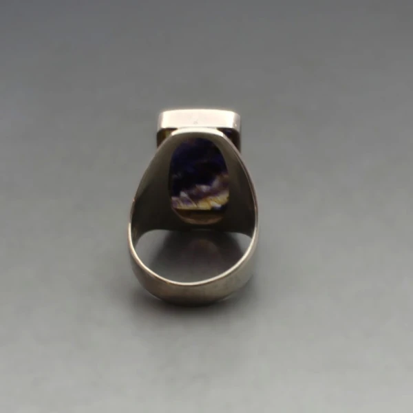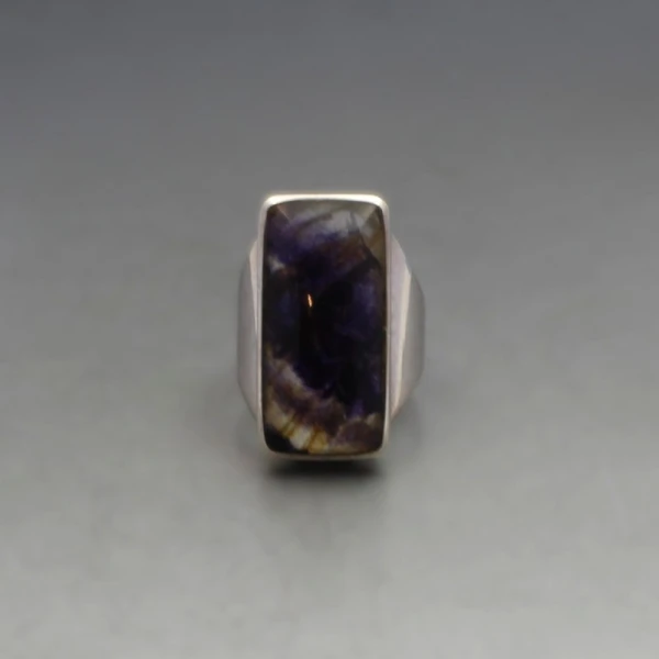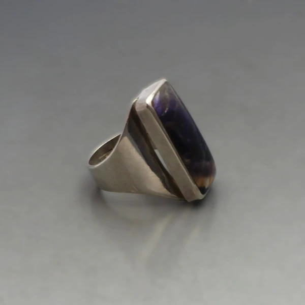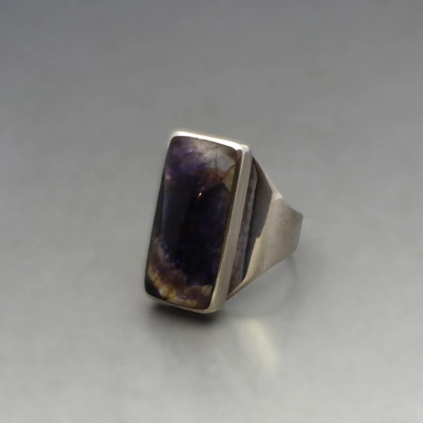 Lovely vintage David Scott Walker blue john and sterling silver chunky modernist ring. The blue john stone is bezel set within an open backed sterling silver setting. The rectangular frontage measures approximately 2.6 x 1.2 cm. It is approximately a UK size Q. Weight is 11 grams. It is signed with makers marks "DSW 925" and has silver hallmarks for Sheffield 2001 on the inner side. It is in very good condition.