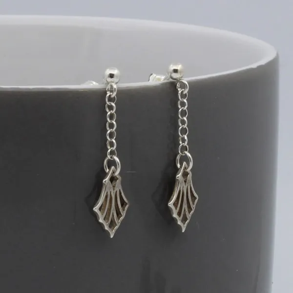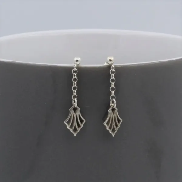 Simple sterling silver art deco style fan detail and chain drop earrings. The earrings have sterling silver post and butterfly fittings. The drop length (from the highest point of the earring) is approximately 2.5 cm. The fan part measures approximately 1cm x 0.8 cm