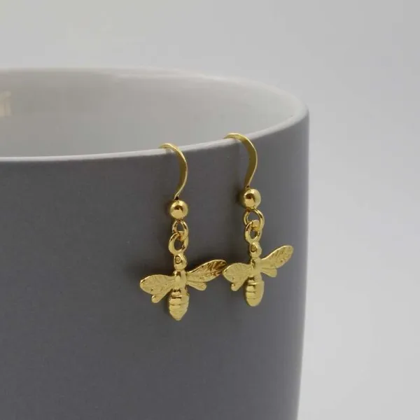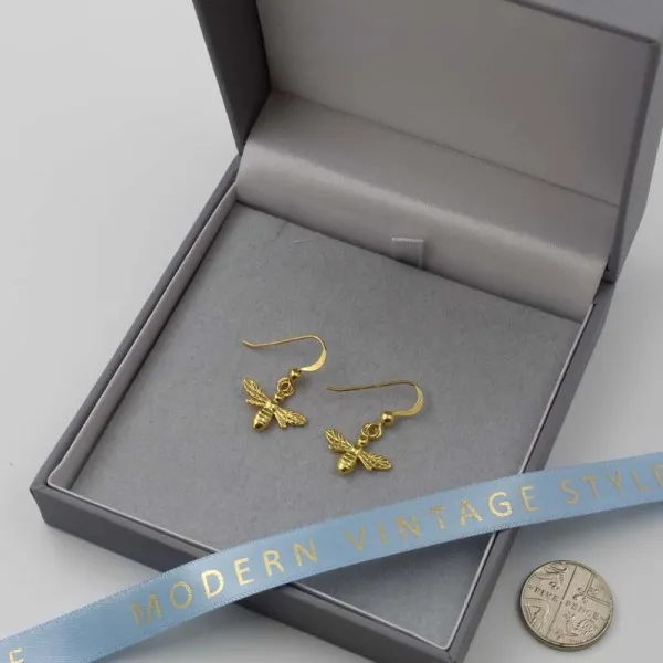 Delicate and detailed gold vermeil bumblebee drop earrings with gold vermeil ear wires. The drop length (from the highest point of the earring) is approximately 2.4 cm. The bumblee part measures approximately 1.5cm x 1.1cm .(Gold Vermeil is gold plated sterling silver.)
