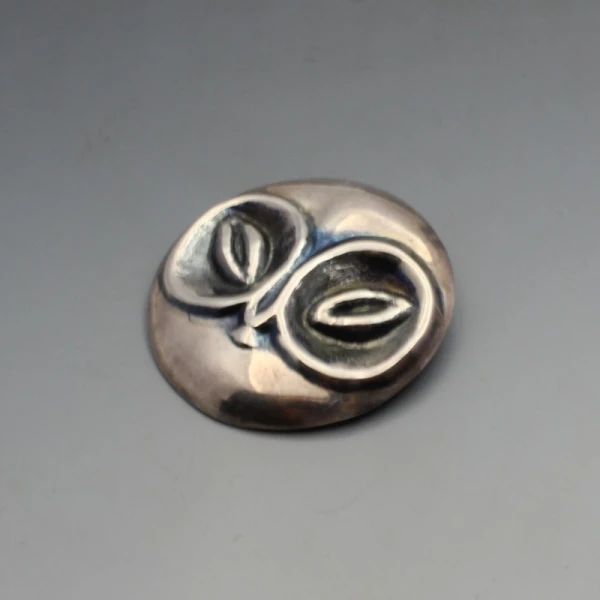 Vintage designer Dellapina Peru sterling silver modernist owl brooch. It has a pin and rollover C clasp closure to the rear. It is signed "925 Dellapina" on the rear. The brooch measures approximately 4 cm in diameter. Weight is 14 grams. It is in very good condition.