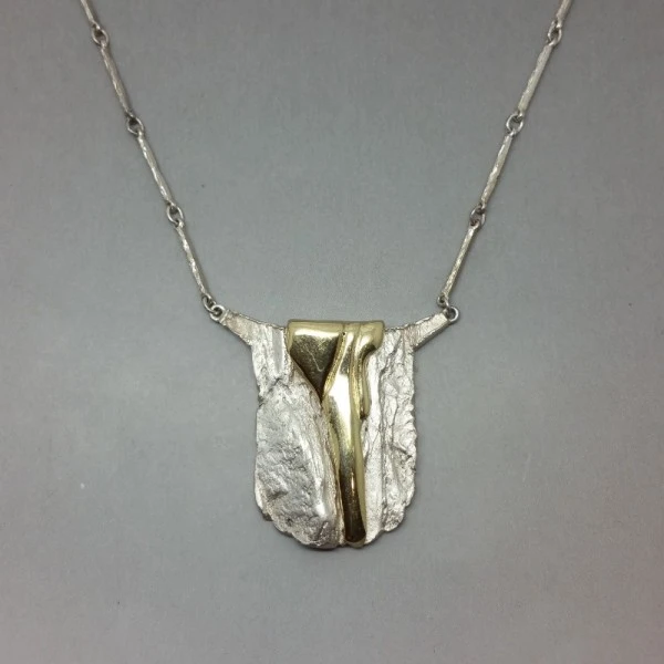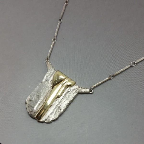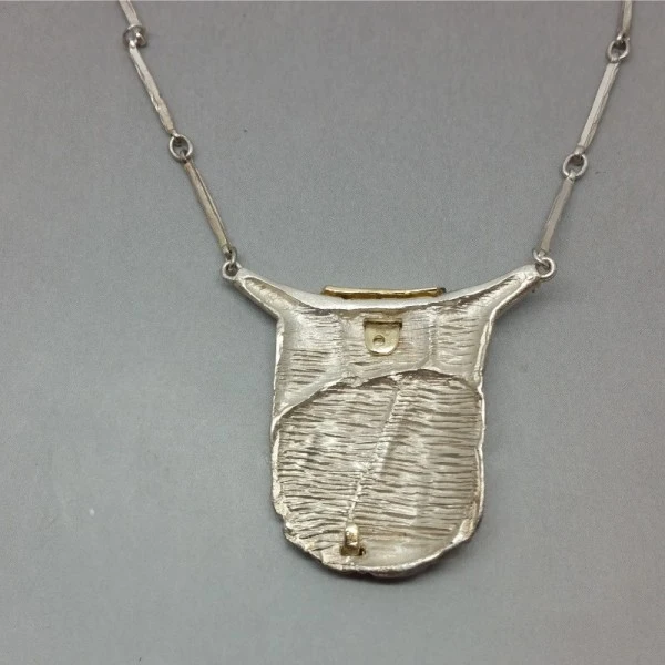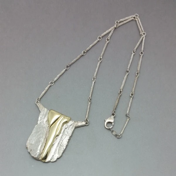 Beautiful Danish vintage modernist GIFA sterling silver necklace. The front of the pendant has a detailed textured sterling silver and gold vermeil design. The rear of the necklace has a textured finish and is signed with " 925S GIFA". It has a lovely 16 inch (41cm) sterling silver bar link chain with lobster clasp closure. The pendant part measures approximately 3 x 3.4 cm . It is in excellent condition and is estimated to date from the 1970's. Condition: Excellent Colour/Gemstone: Silver Metal: Sterling Silver Size: 16 inches chain and3 x 3.4cm pendant Era: Estimated 1970's