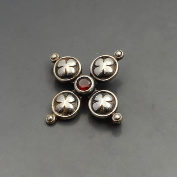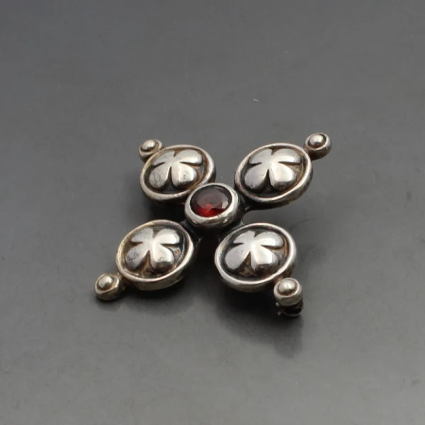 Vintage decorative sterling silver cross type brooch with small garnet to the centre. It has a sterling silver pin and C clasp closure to the rear and measures approximately 4.1 x 4.1 cm. Weight is 9 grams. It has makers mark "HO", and "925" and the silver date mark for 1997 on the rear. It is in very good condition .