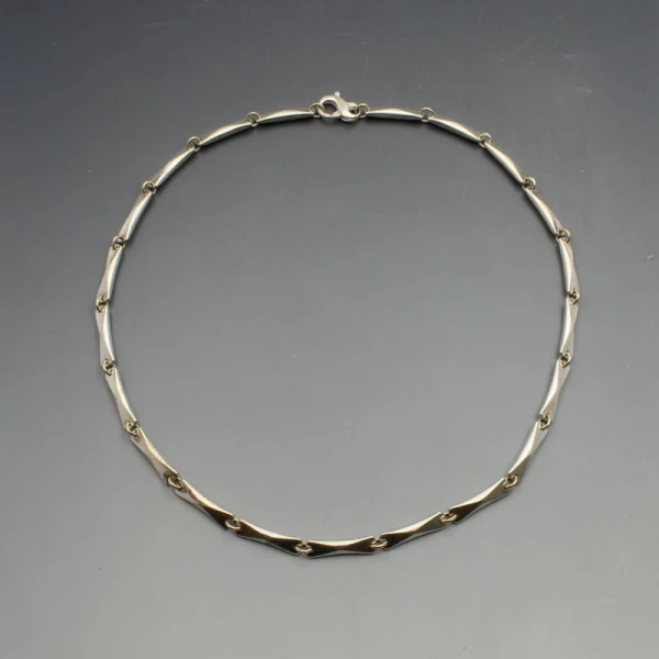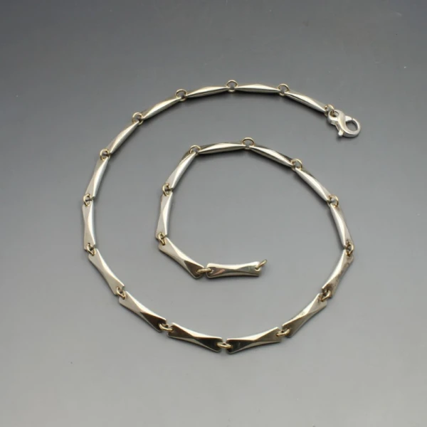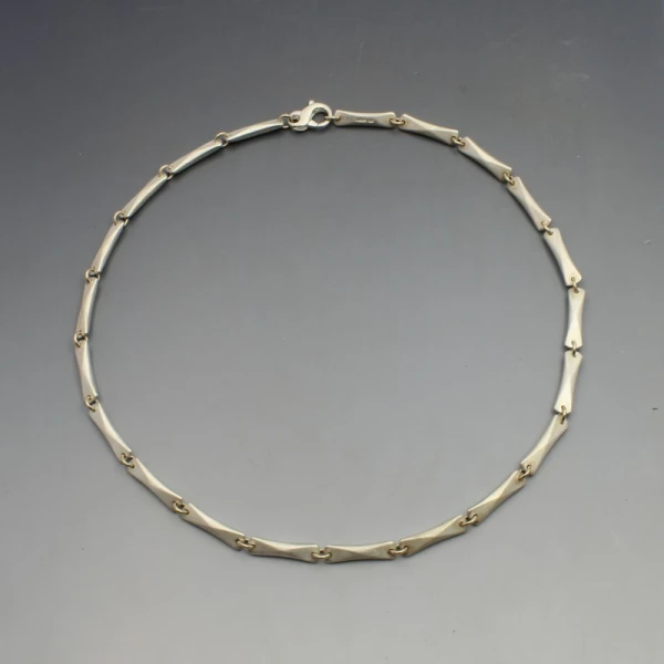 Sleek vintage designer sterling silver necklace. It has decorative slim sterling silver links and a lobster clasp closure. The necklace measures approximately 17 inches (43 cm) x 0.5 cm wide. It is marked "925", has makers marks "GO", and also indistinct London silver hallmarks. Weight is 42 grams. It is in very good condition. A matching designer silver bracelet is available