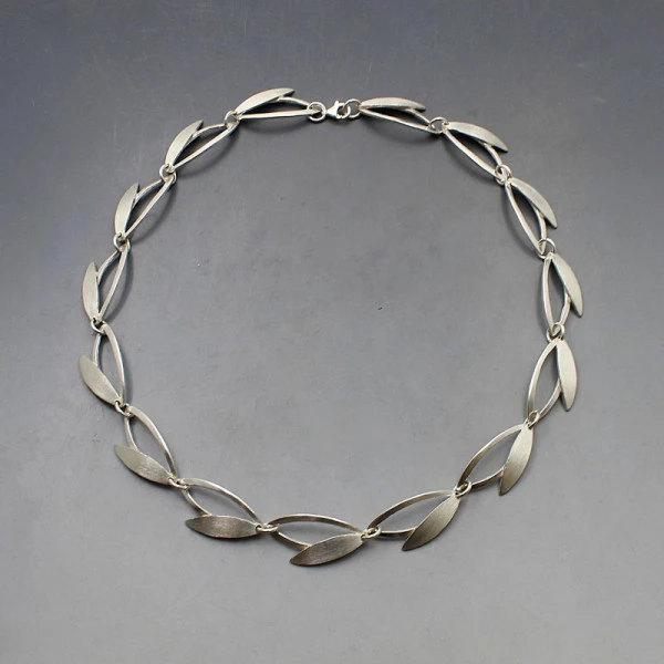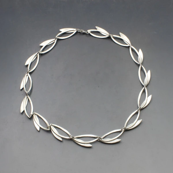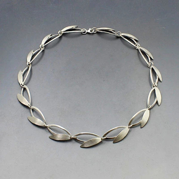 Beautiful vintage designer sterling silver modernist necklace with silver leaves design. The necklace measures approximately 16 inches (41 cm) long x 1.3 cm wide (at the widest part) and has a lobster clasp closure. Weight is 31 grams. The necklace is marked "925" and has indistinct makers marks and silver hallmarks It is in very good condition. Condition: Very good Colour/Gemstone: Silver Metal: Sterling silver Size: Approximately 16 inches (41 cm) Era: