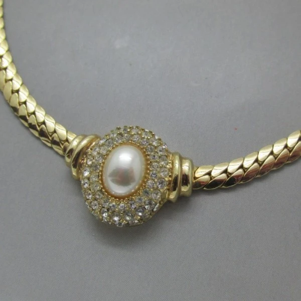 This vintage Christian Dior necklace features an oval central faux pearl as the focal point with a surround of clear sparkling diamante clear crystals in a gold tone setting. The necklace has a flat goldtone snake chain with a foldover clasp type closure. The necklace measures approximately 15 inches (39cm) and has a 2 inch extension chain allowing the necklace to extend to 17 (41cm) inches.The CD logo on the extension chain is marked with "Chr Dior" on the rear of the logo and the foldover clasp is also marked with "Chr Dior".The necklace is in excellent condition.