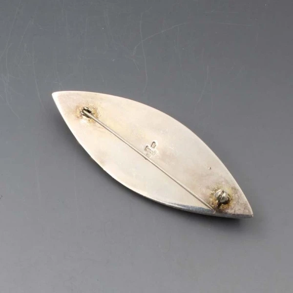 A rare Eigil Jensen for Anton Michelsen vintage modernist Danish silver brooch in the shape of a leaf. The rear of the brooch has a sterling silver pin and rollover C clasp closure. It is signed with a crown symbol "AM", "STERLING DENMARK", and "EJ". It is in very good cond..