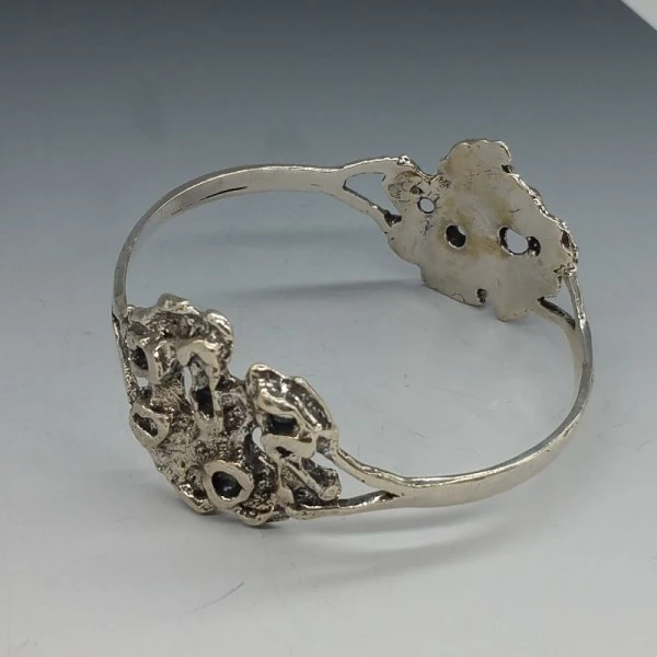 Beautiful vintage designer sterling silver modernist necklace with silver leaves design. The necklace measures approximately 16 inches (41 cm) long x 1.3 cm wide (at the widest part) and has a lobster clasp closure. Weight is 31 grams. The necklace is marked "925" and has indistinct makers mar..
