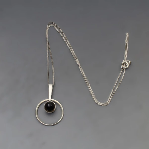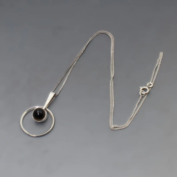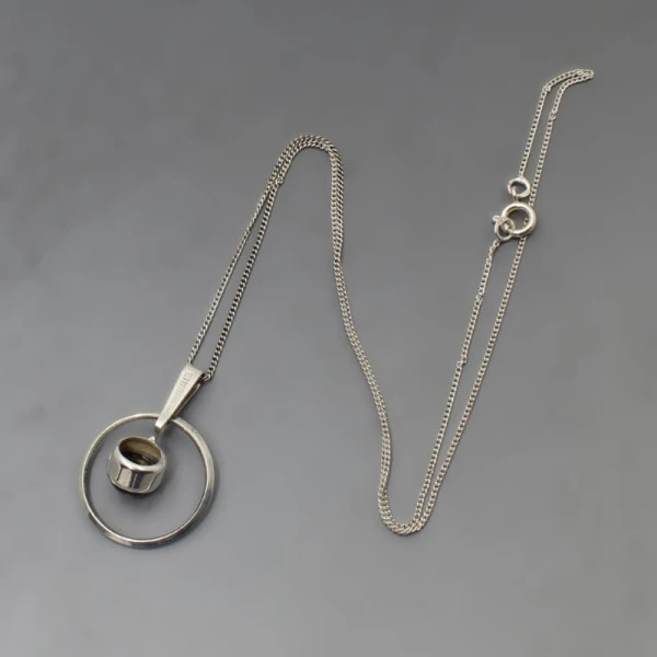 Vintage Ellis Kauppi for Kupittaan Kulta, Finland, modernist sterling silver pendant with a round smokey quartz cabochon set within a modernist silver setting with a slim silver pendant bail. The circular pendant measures approximately 2 cm in diameter. The pendant has a 16 inch (41 cm ) sterling silver chain. Weight is 3 grams. It is signed with the Kupittaan Kulta stamp, and "925 FINLAND". It is in very good condition. Estimated to date from 1960's