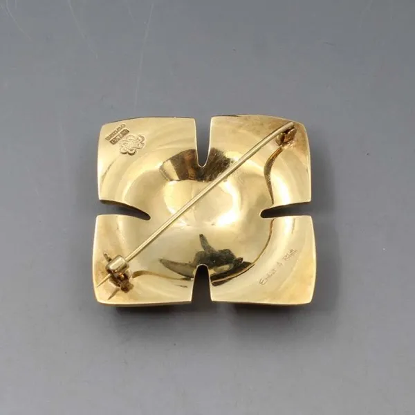 Rare vintage Ernest Blyth for Ivan Tarrat 9 carat gold square shaped modernist brooch. It has a pin and rollover C clasp closure to the rear. It is signed "Ernest A Blyth" and "Ivan Tarrat Eng", and has 9 carat gold hallmarks for Birmingham 1967 ( 9 375 , an anchor and letter S). The brooch measures approximately 3.4 x 3.4 cm. Weight is 20.7 grams . It is in very good condition