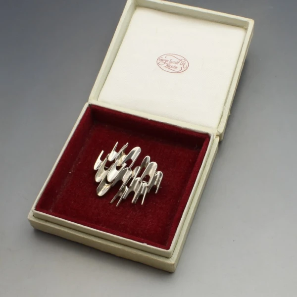 Vintage Ernest Blyth design for Ivan Tarratt Ltd, modernist sterling silver brooch. It has a silver pin and rollover C clasp closure to the rear. It is signed "Ernest A Blyth", "IVAN TARRAT ENG","G.T.L", and has silver hallmarks for Birmingham 1965. The brooch measures approximately 4 x 3.5 cm. Weight is 10 grams. It comes with the original George Tarrat box. It is in very good condition with small signs of wear commensurate with age.
