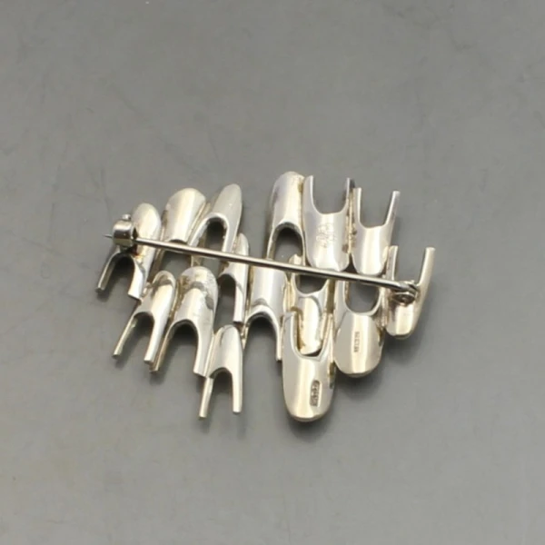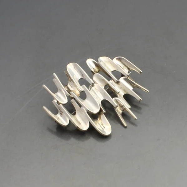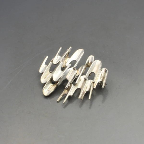 Rare Ernest Blyth for Georg Tarrat sterling silver modernist brooch. It has a pin and rollover C clasp closure to the rear. It is signed "Ernest A Blyth" ,"IVAN TARRAT ENG", "GTLd", "No 66", and has silver hallmarks for Birmingham 1962. The brooch measures approximately 6.5 x 2.5 cm..