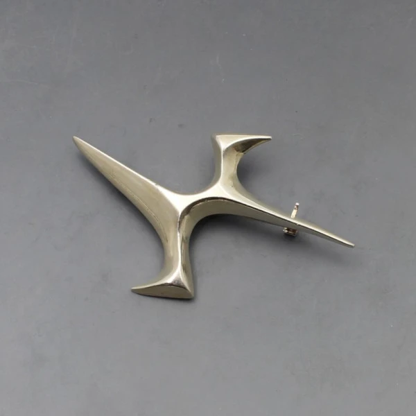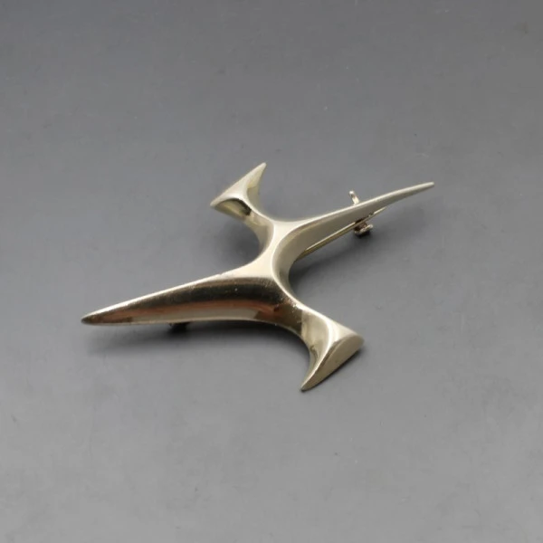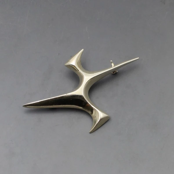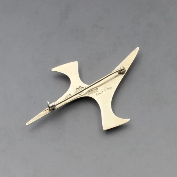 Beautiful Ernest Blyth for Ivan Tarratt Ltd modernist sterling silver "flight" brooch. It is signed "Ernest A Blyth", "G.T.Ld", and "Ivan Tarrat Eng" and has silver hallmarks for Birmingham 1967. The brooch measures approximately 6.5 x 4.3 cm and has a silver pin and C clasp closure to the rear. Weight is 14 grams. It is in very good condition.