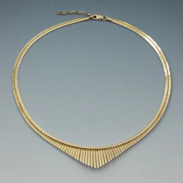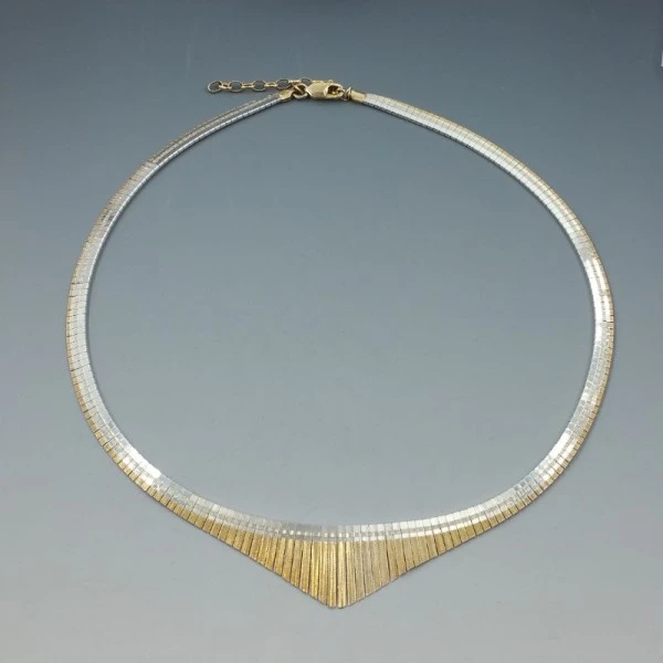 Beautiful quality fine vintage Italian sterling silver necklace. It is a round style vintage modernist style necklace with a lobster clasp closure. The inner part of the necklace is sterling silver. The outer line and fringe area of the necklace (and the rear) is light gold vermeil. (Gold vermeil is gold plated sterling silver.) It is marked "925" and "Italy" on the rear. The necklace measures approximately 18 inches (46 cm) and is extendable by a further 2 inches to 20 inches (51cm). Weight is 25.5 grams. It is in very good condition.