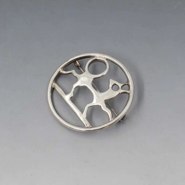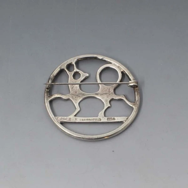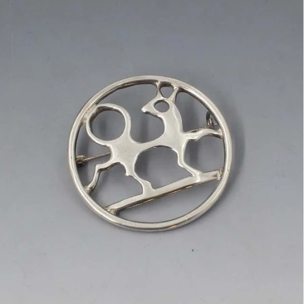 Rare Frank Juhls, Norway, stylised reindeer brooch. It has a pin and C clasp closure to the rear. It is signed "JUHLS, KAUTOKEINO 925S" on the rear. The brooch measures approximately 4.7 cm in diameter. Weight is 14.5 grams. It is in very good condition